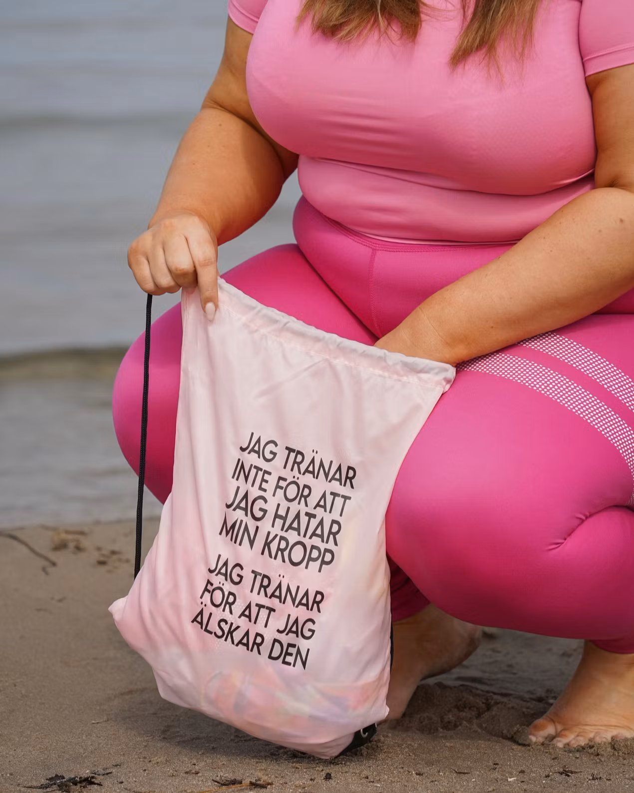 * Gympapåse i rosa med texten "Jag tränar inte för att jag hatar min kropp, jag tränar för att jag älskar den" i svart. Mått 34 x 44 cm. Rymmer 13 liter.