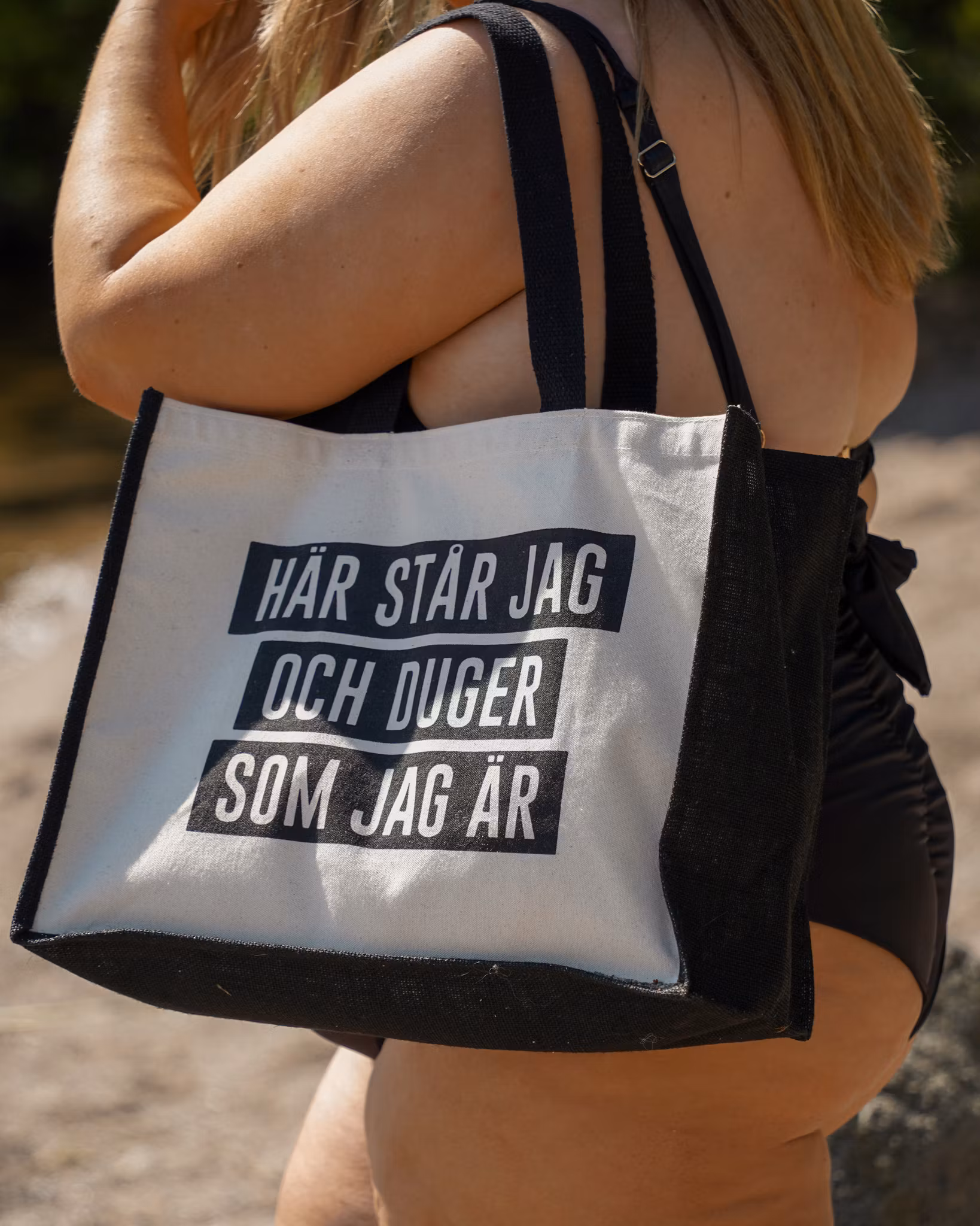 * Naturfärgad strandväska med hård botten och trycket "Här står jag och duger som jag är". Påsens storlek är 42 x 33 x 19 cm. Handtagens längd är 65 cm. Volym 21 liter.
