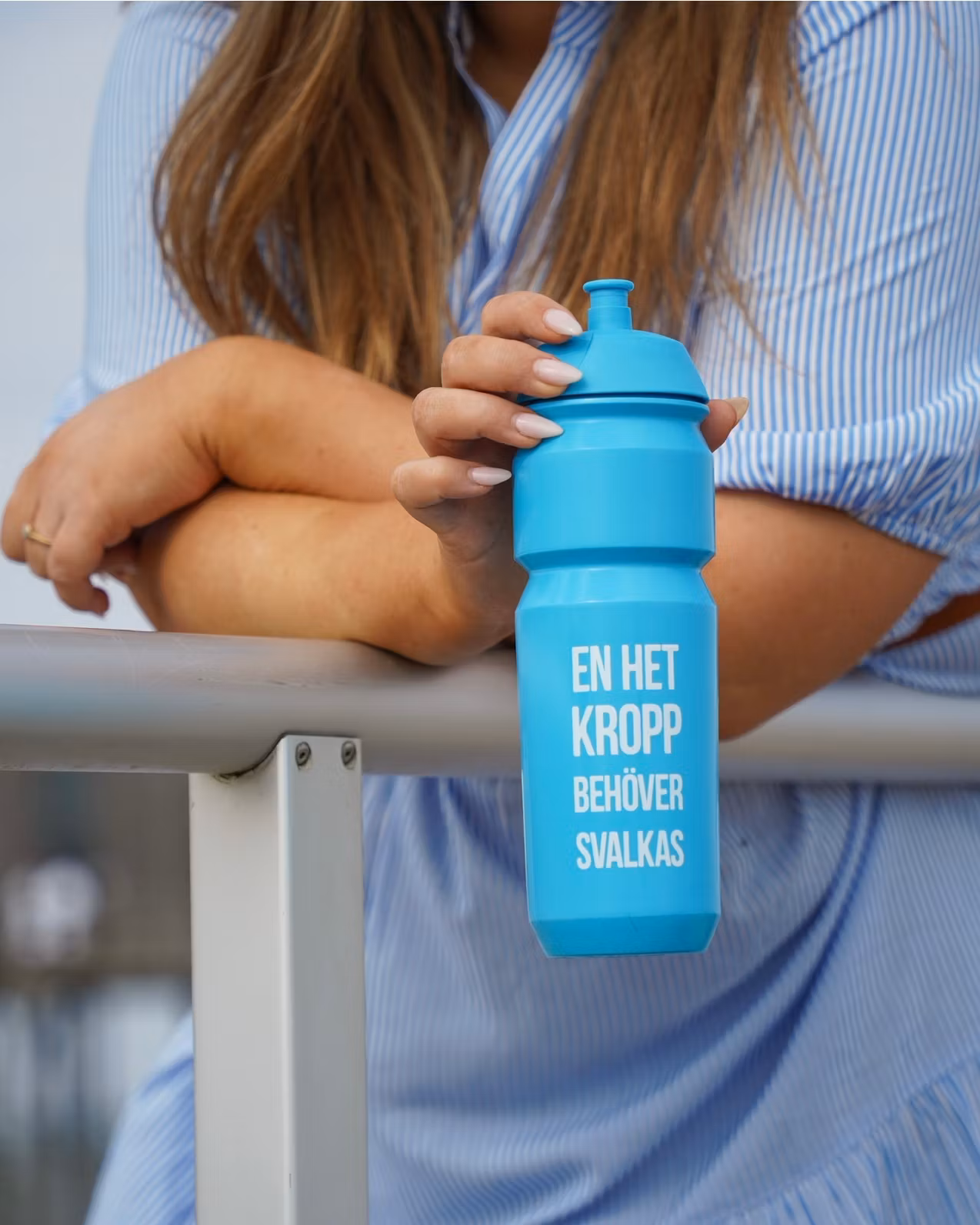* Vattenflaska i blått med texten "En het kropp behöver svalkas" i vitt. Rymmer 75 cl.