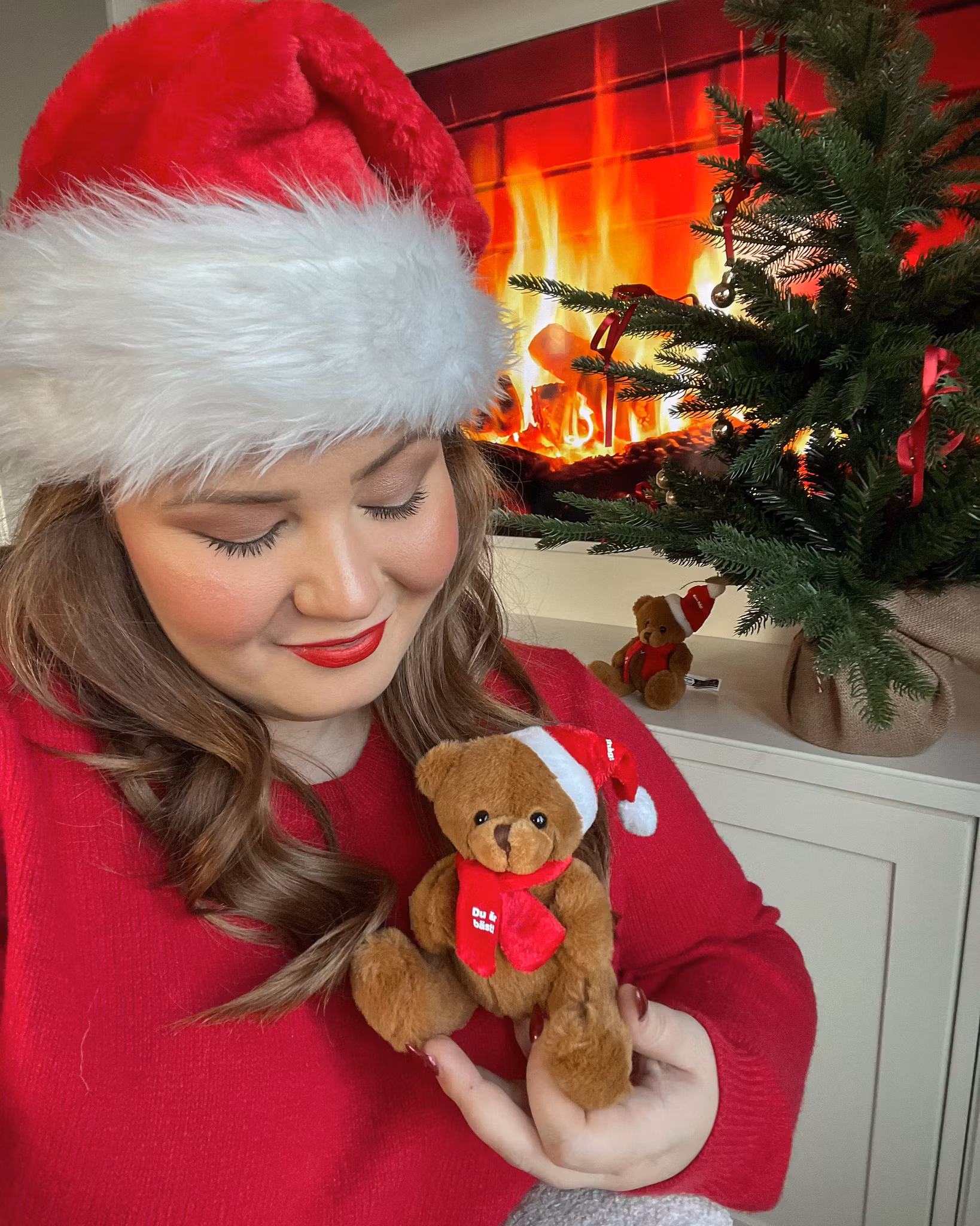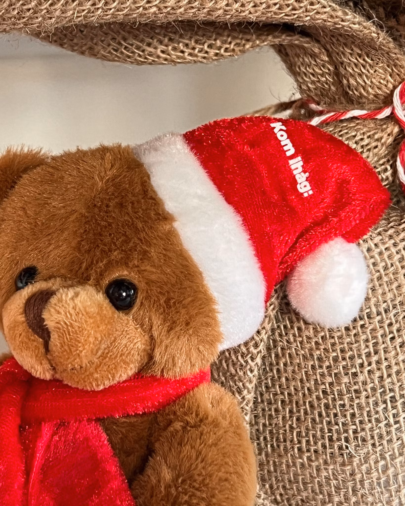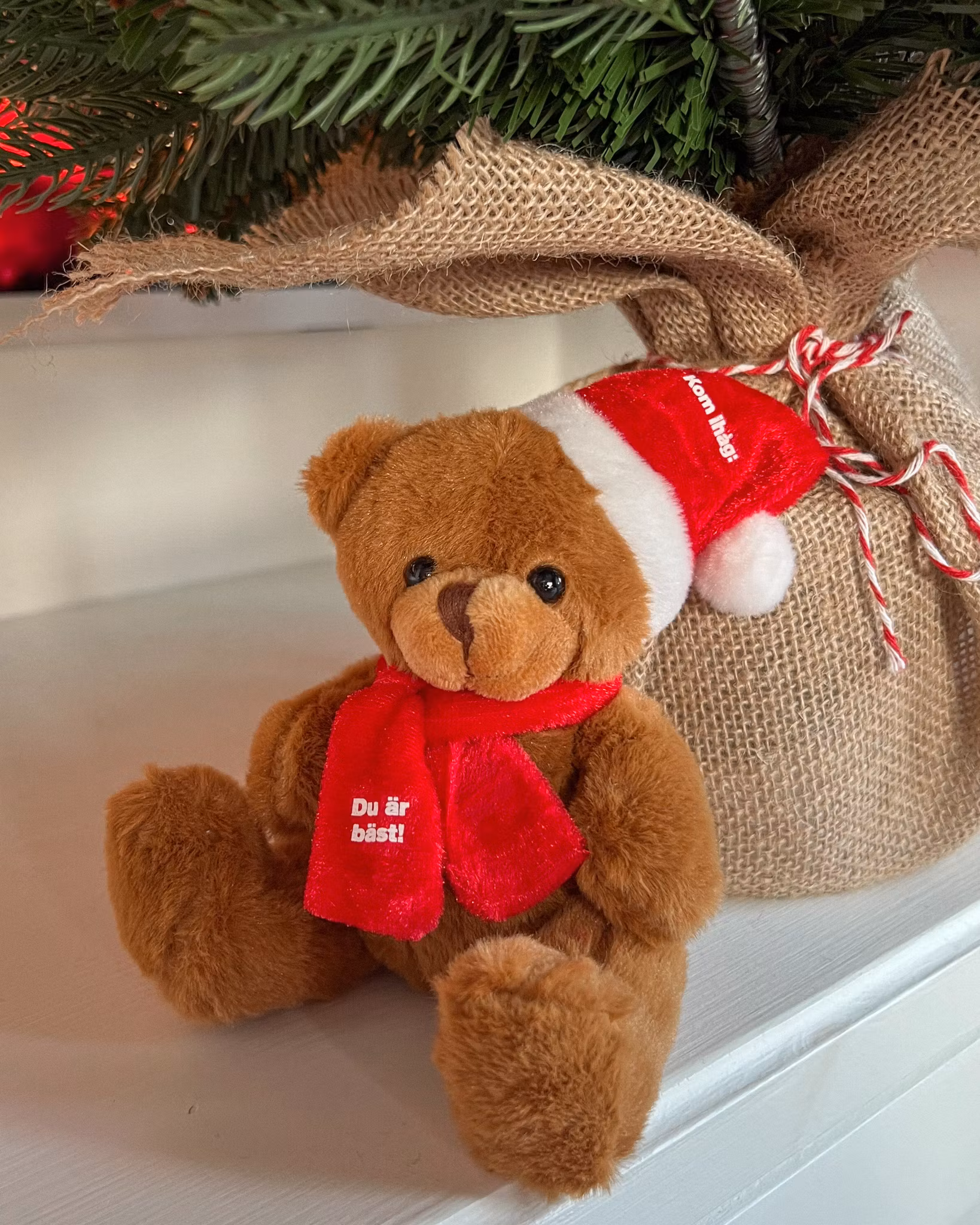 Mjukt gosedjur i form av en brun nallebjörn med röd luva och halsduk. Nallen är 12 cm hög.