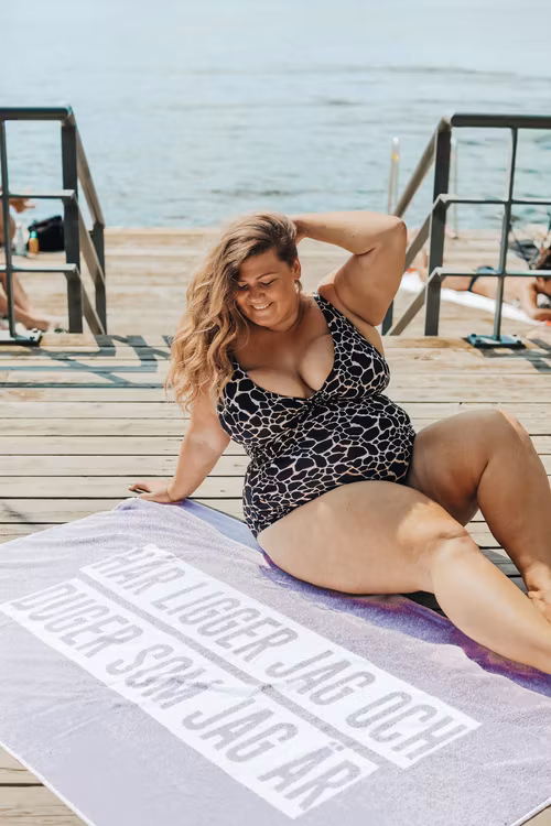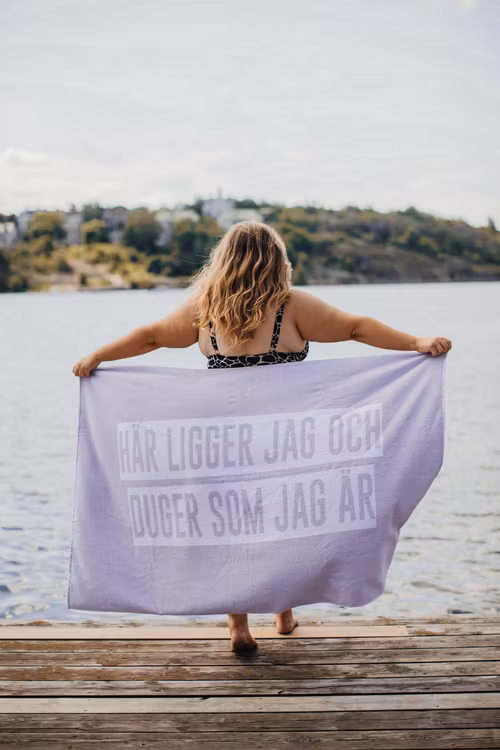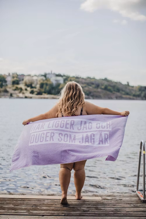 * Lila strandbadlakan med invävd text "Här ligger jag och duger som jag är". Bomullsfrotté. Storlek 150 x 100 cm.