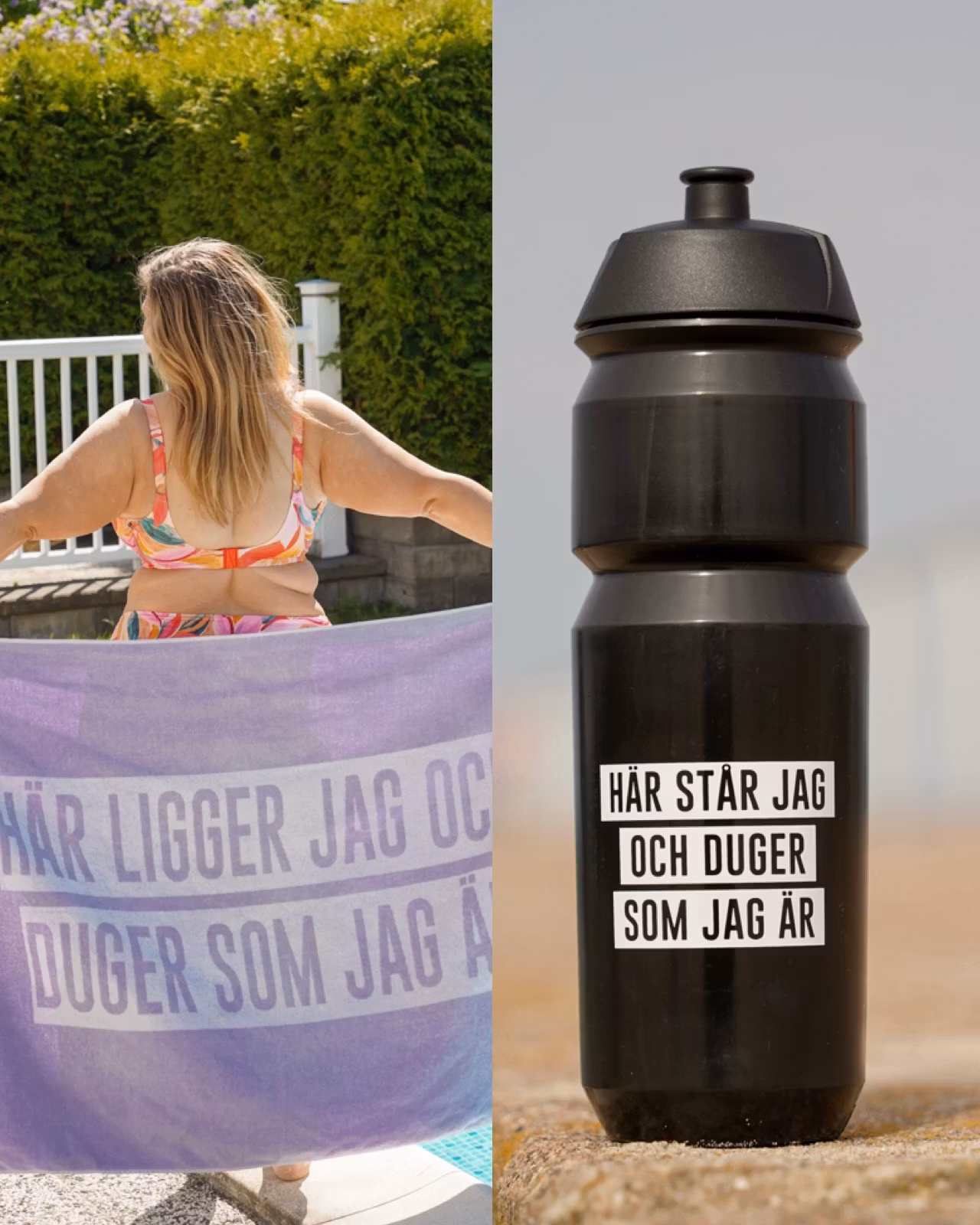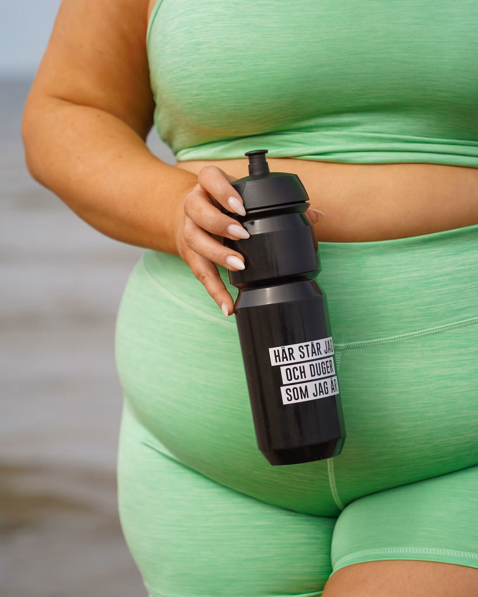 * Vattenflaska i svart med texten "Här står jag och duger som jag är" i vitt. Rymmer 75 cl.