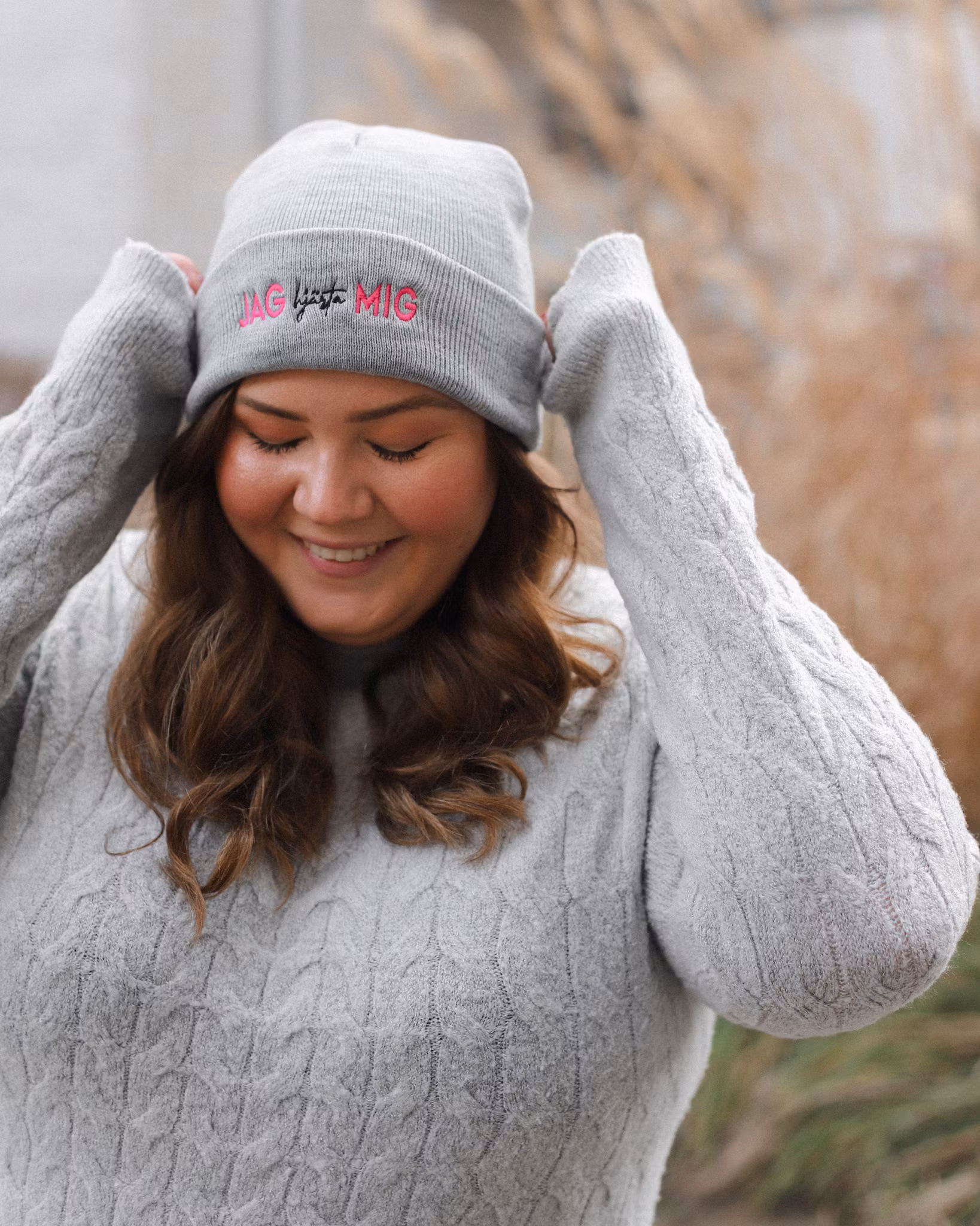 - Grå stickad mössa med motivet "Jag hjärta mig" broderat i rosa och svart