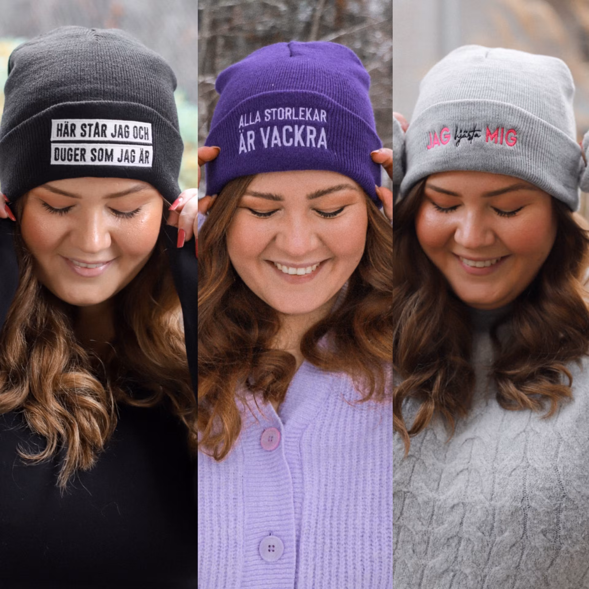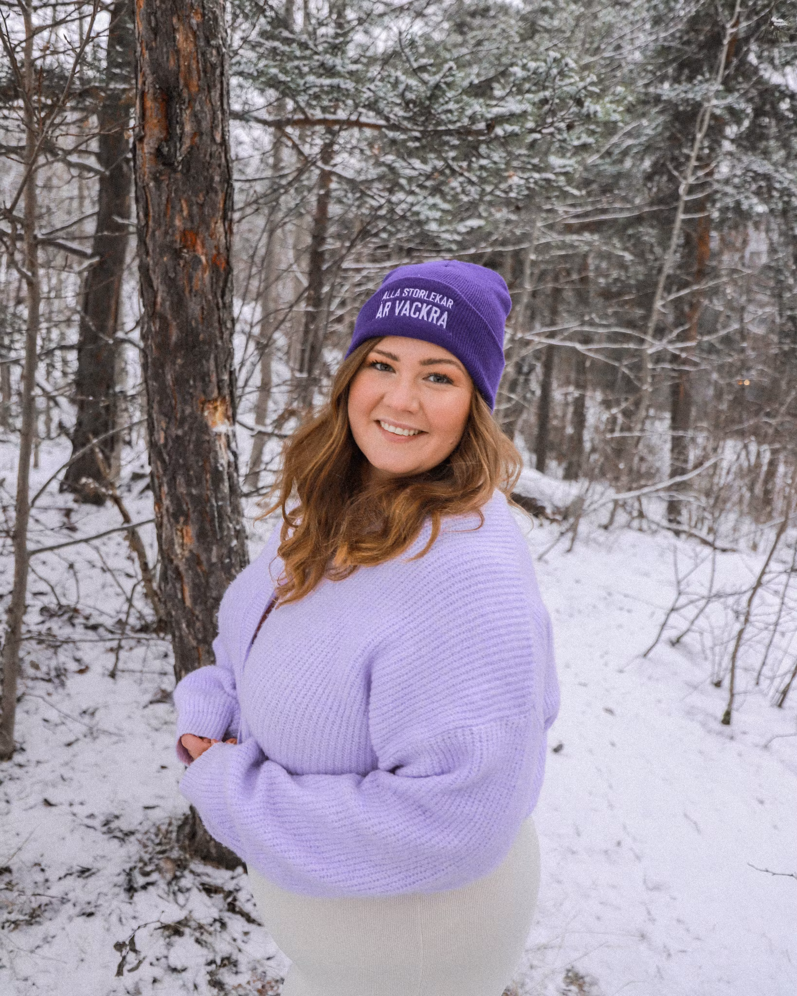 - Lila mössa med motivet "Alla storlekar är vackra" broderat i vitt