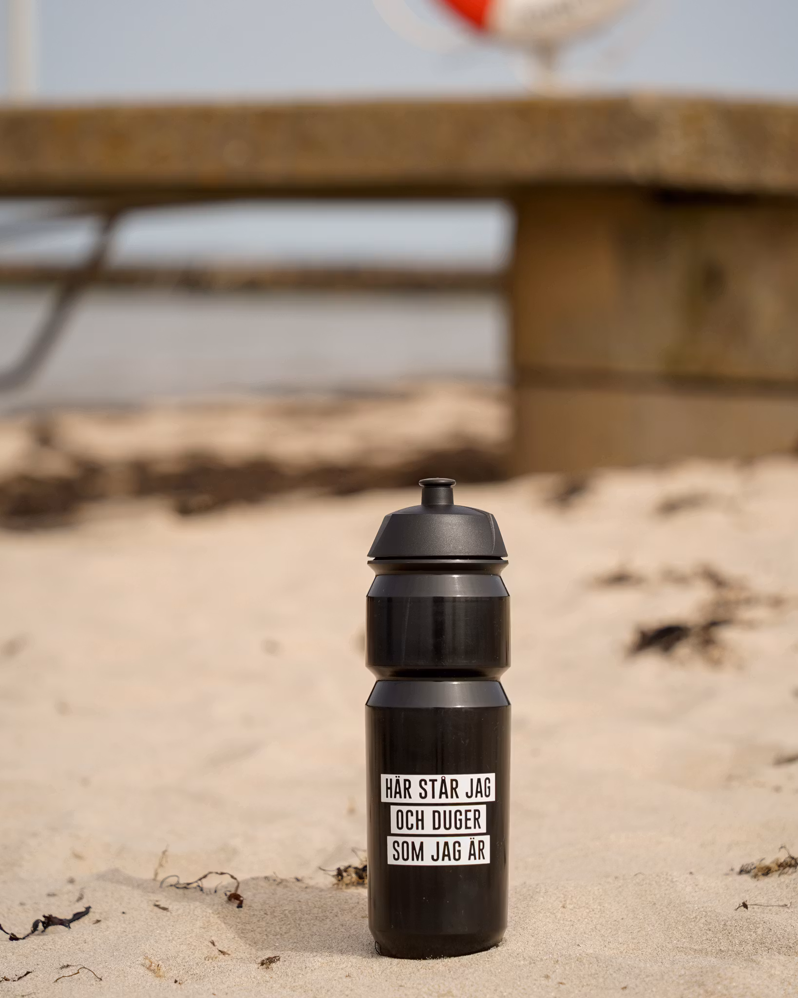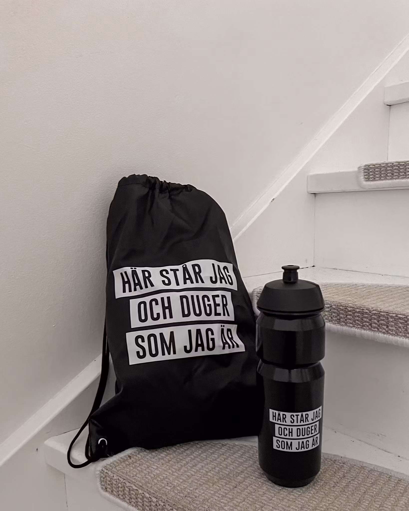 - Svart vattenflaska med texten "Här står jag och duger som jag är" i vitt. Rymmer 75 cl.