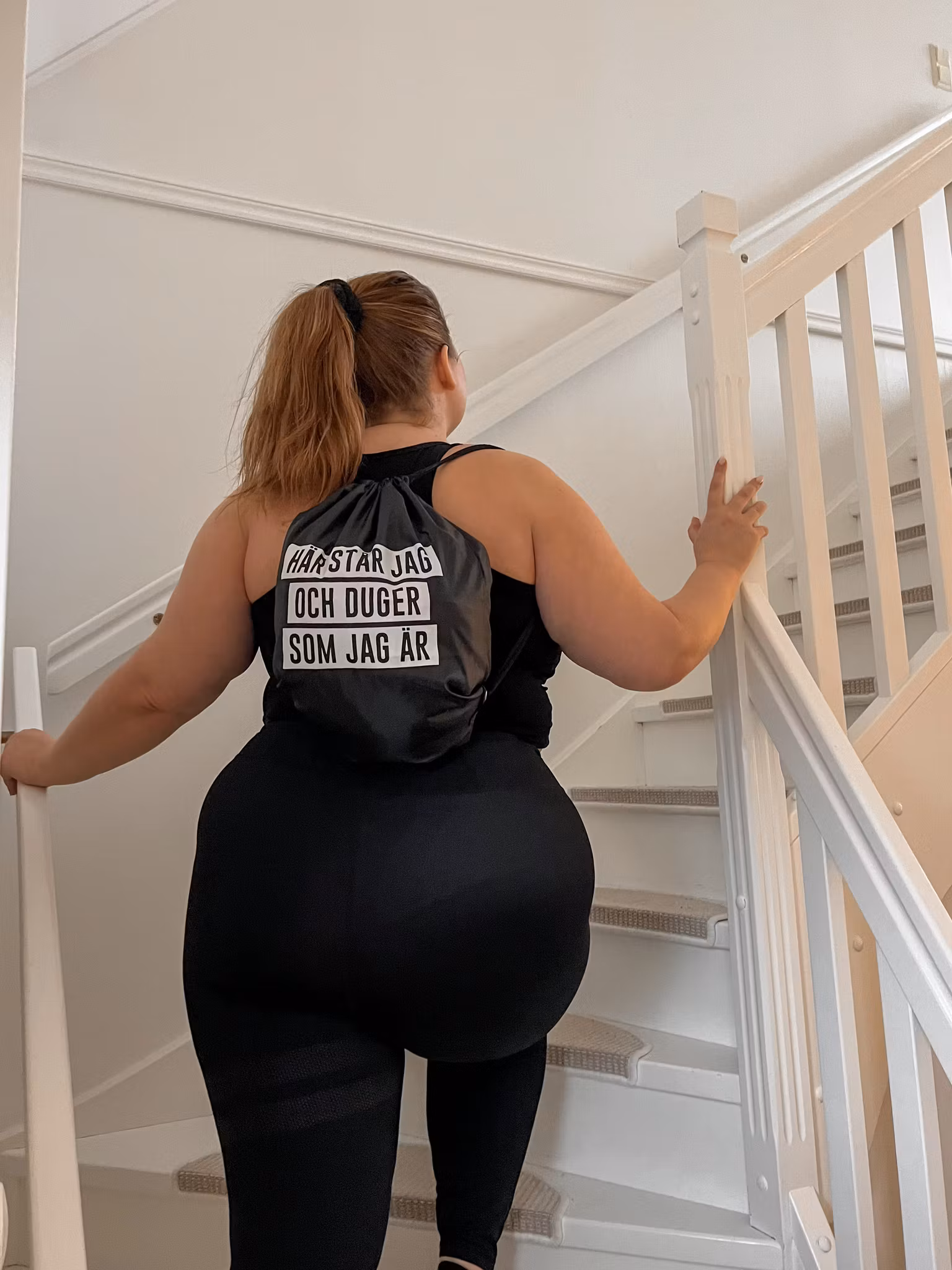 - Svart gympapåse med texten "Här står jag och duger som jag är" i vitt. Mått 34 x 44 cm. Rymmer 13 liter. Påsarna har förstärkta hörn och dragskoöppning.