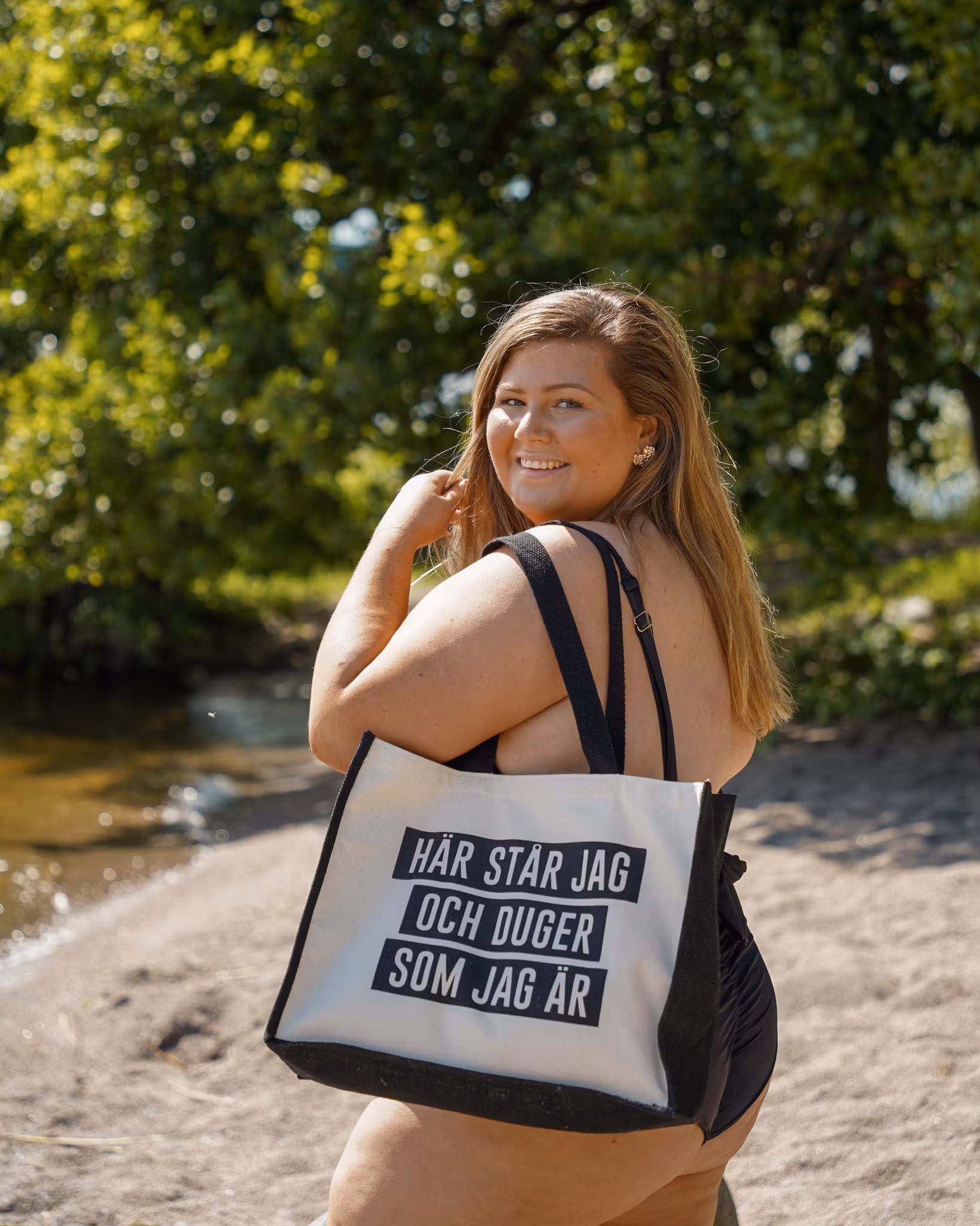 * Naturfärgad strandväska med hård botten och trycket "Här står jag och duger som jag är". Påsens storlek är 42 x 33 x 19 cm. Handtagens längd är 65 cm. Volym 21 liter.