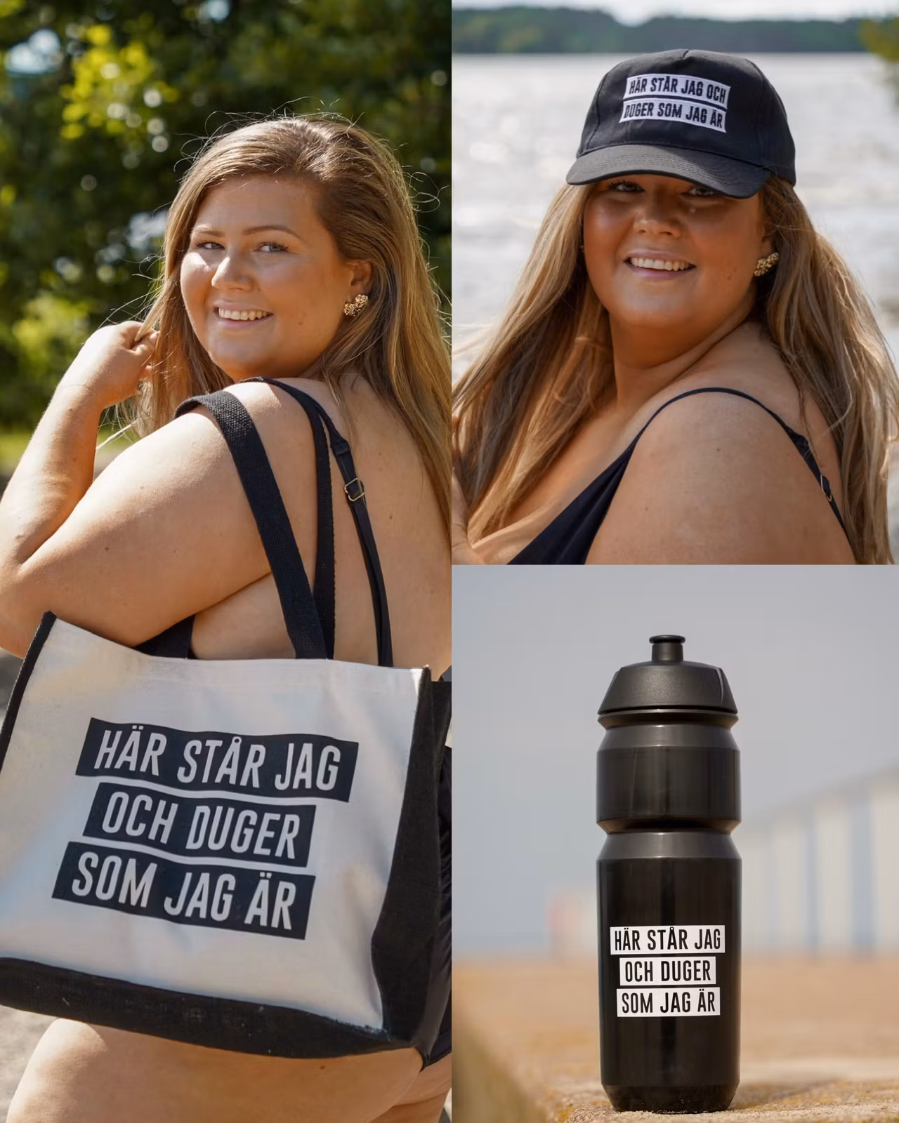 * Vattenflaska i svart med texten "Här står jag och duger som jag är" i vitt. Rymmer 75 cl.