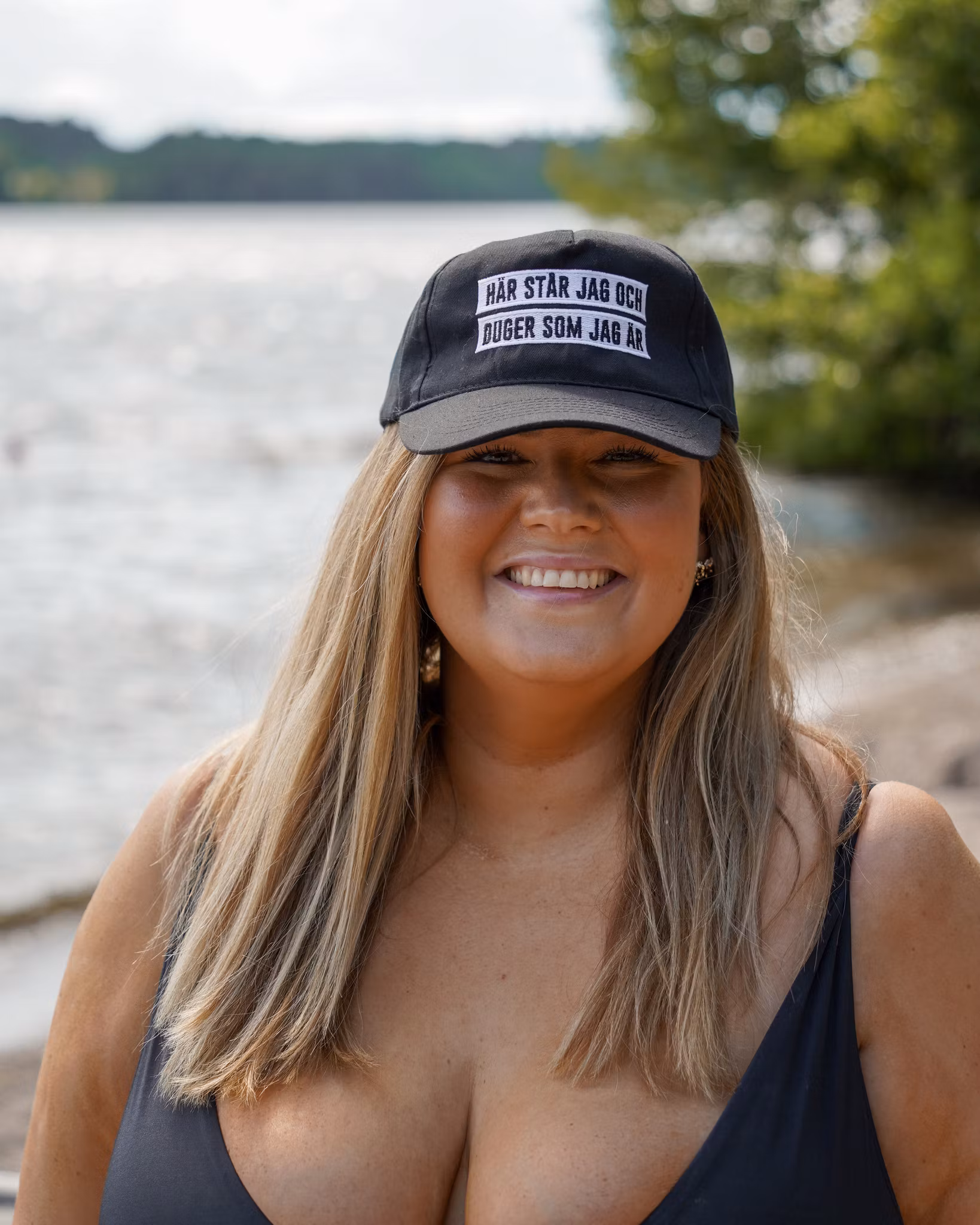 * Svart keps med motivet "Här står jag och duger som jag är" broderat i vitt. Justering med kardborreband i nacken.