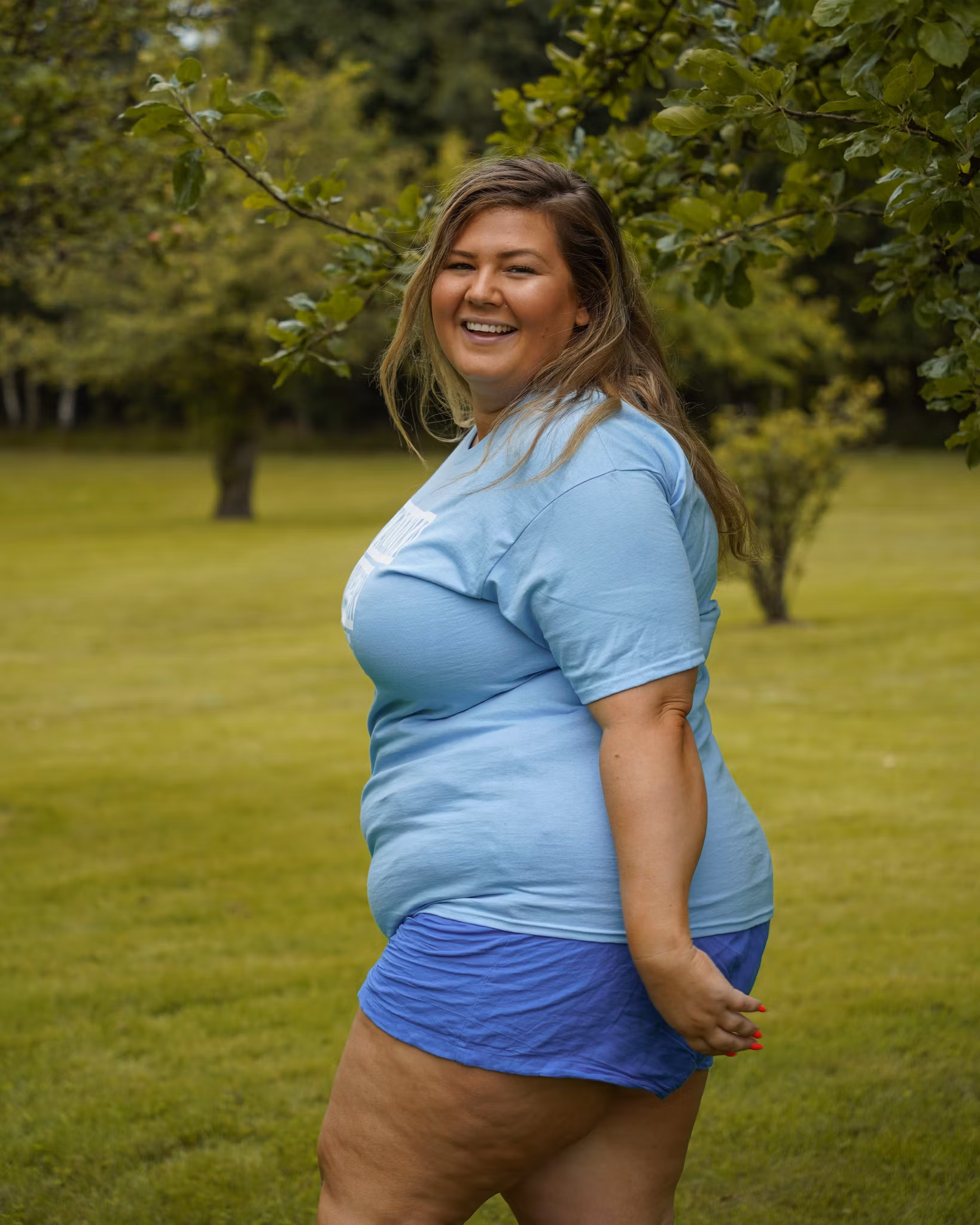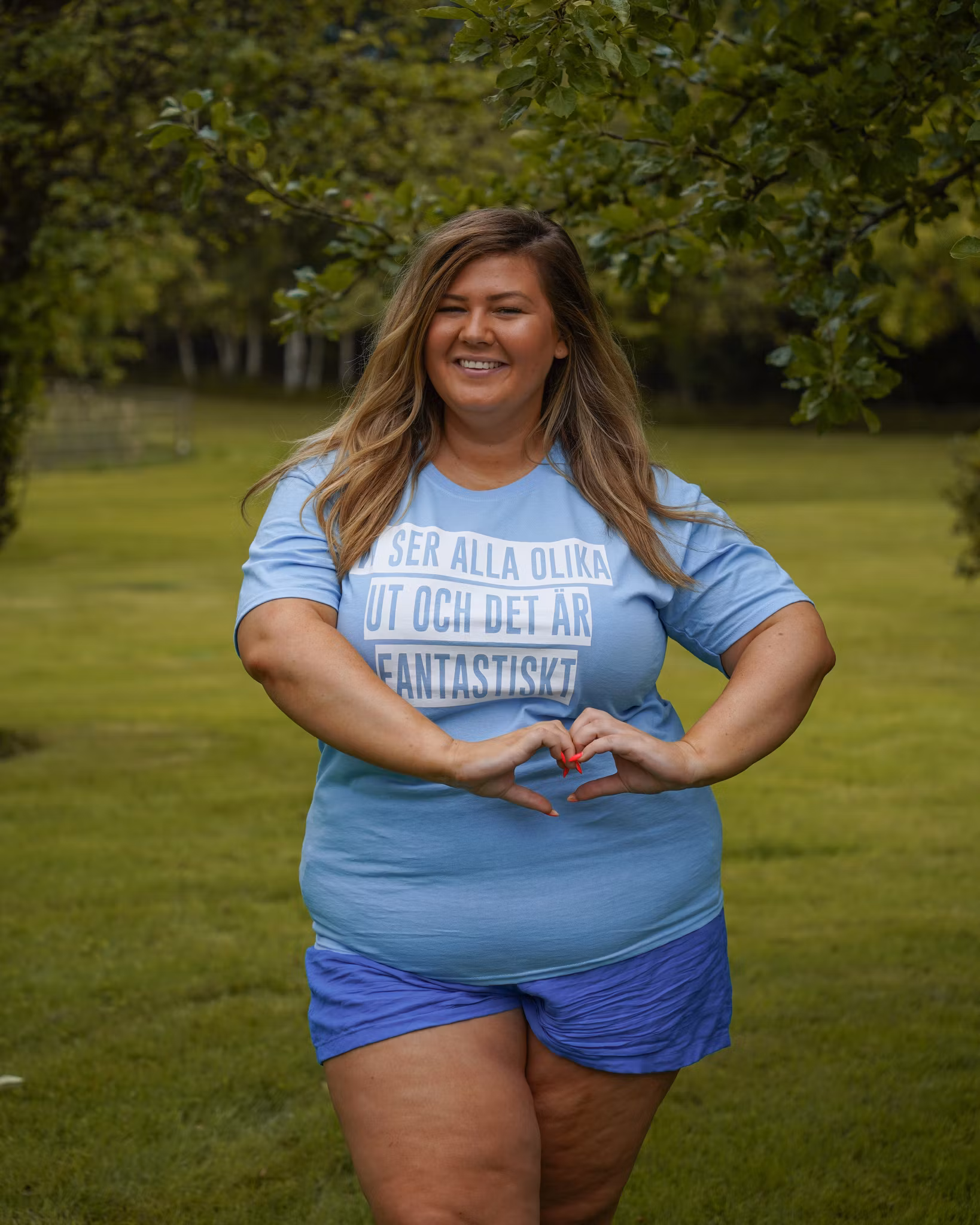 Blå t-shirt i unisexmodell med trycket "Vi ser alla olika ut och det är fantastiskt" på.