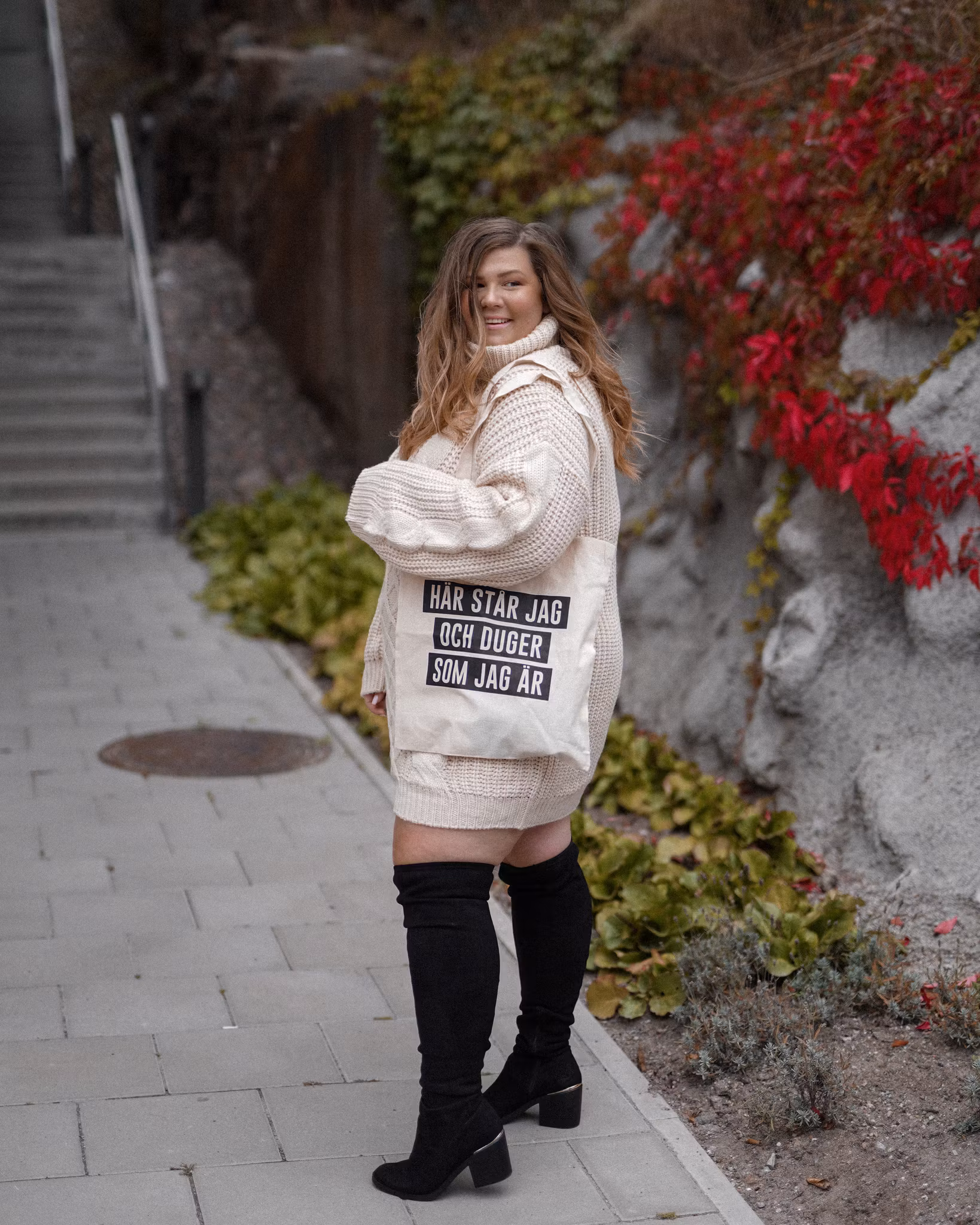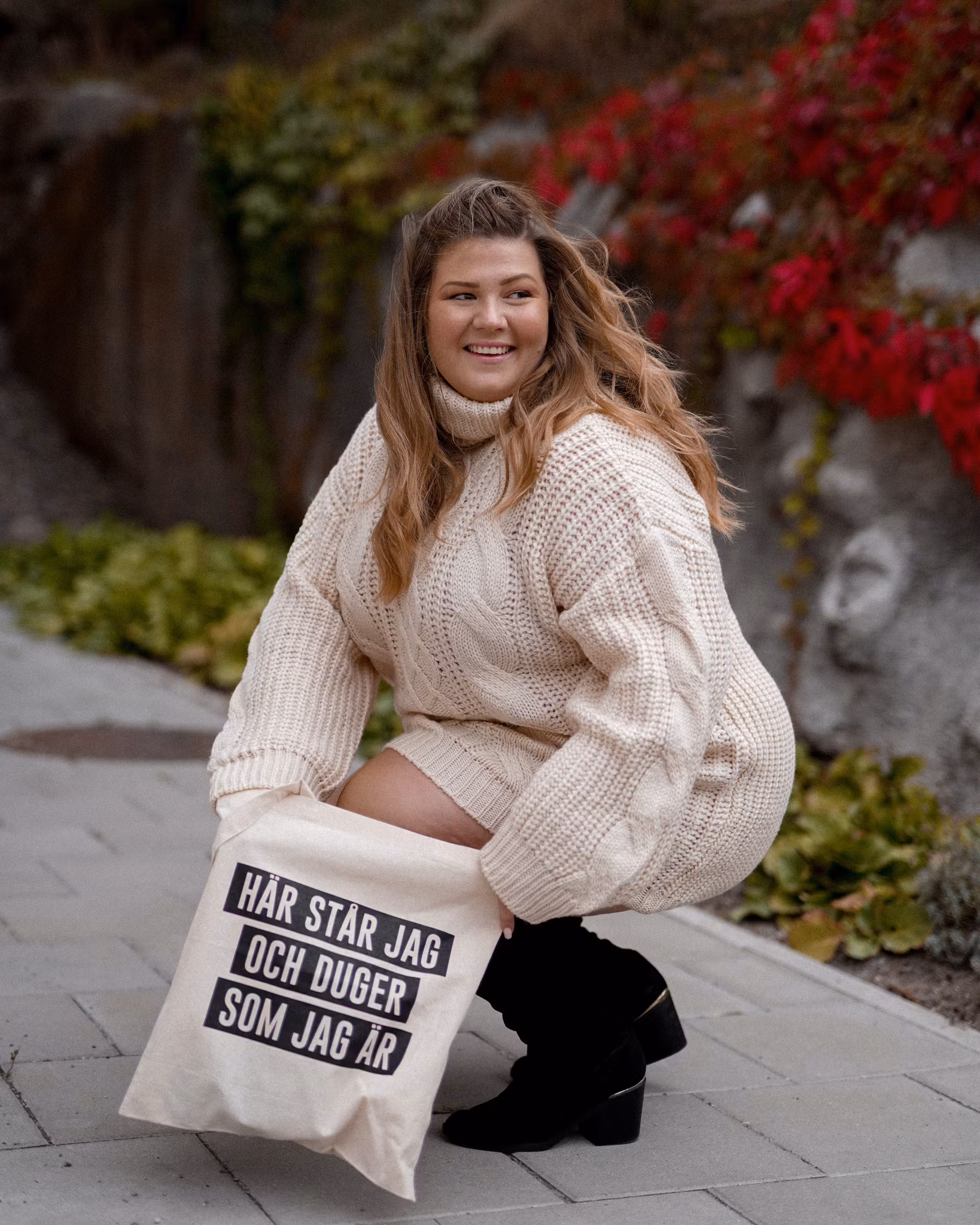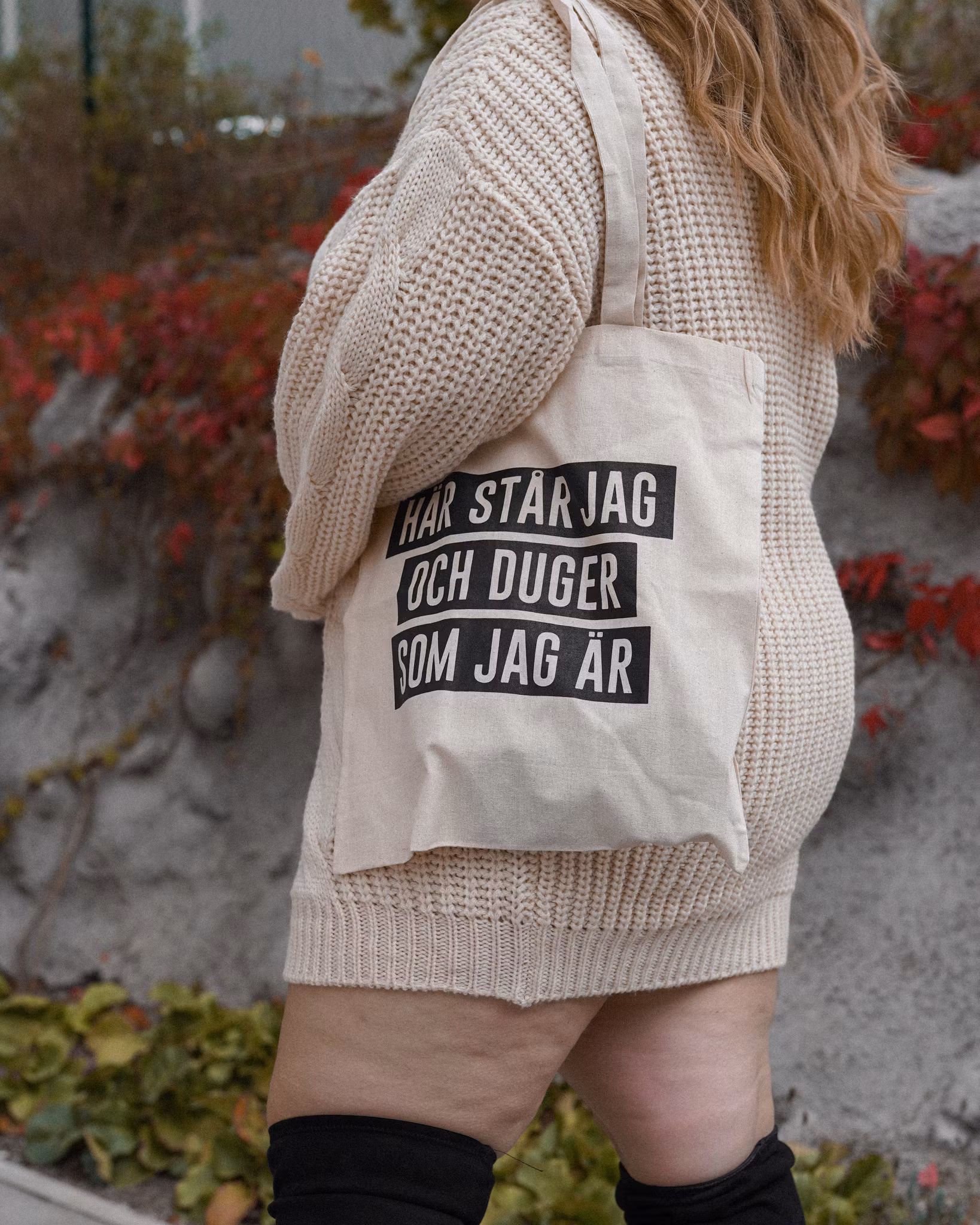 Paket med tygpåse + strandväska med trycket "Här står jag och duger som jag är". Paketet innehåller: