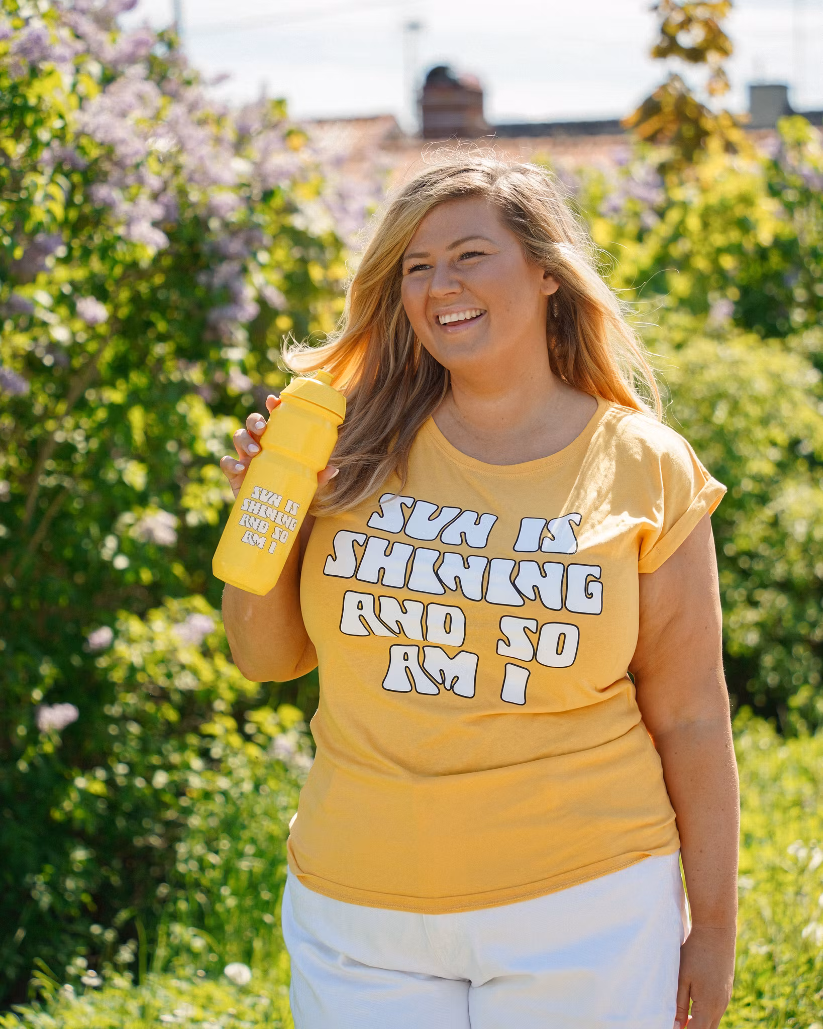 Vattenflaska i gult med texten "Sun is shining and so am I" i vitt och svart.